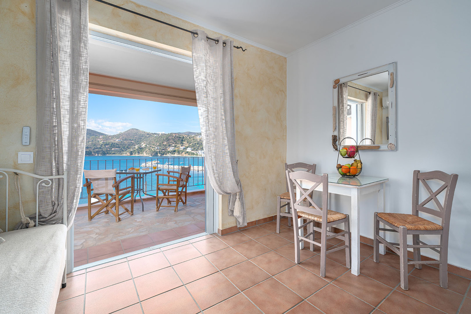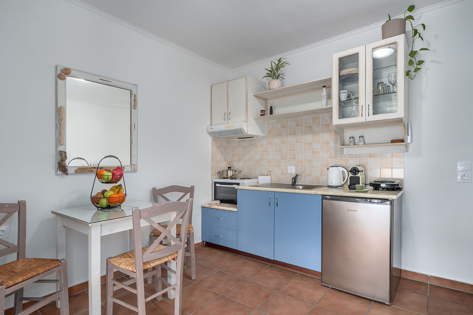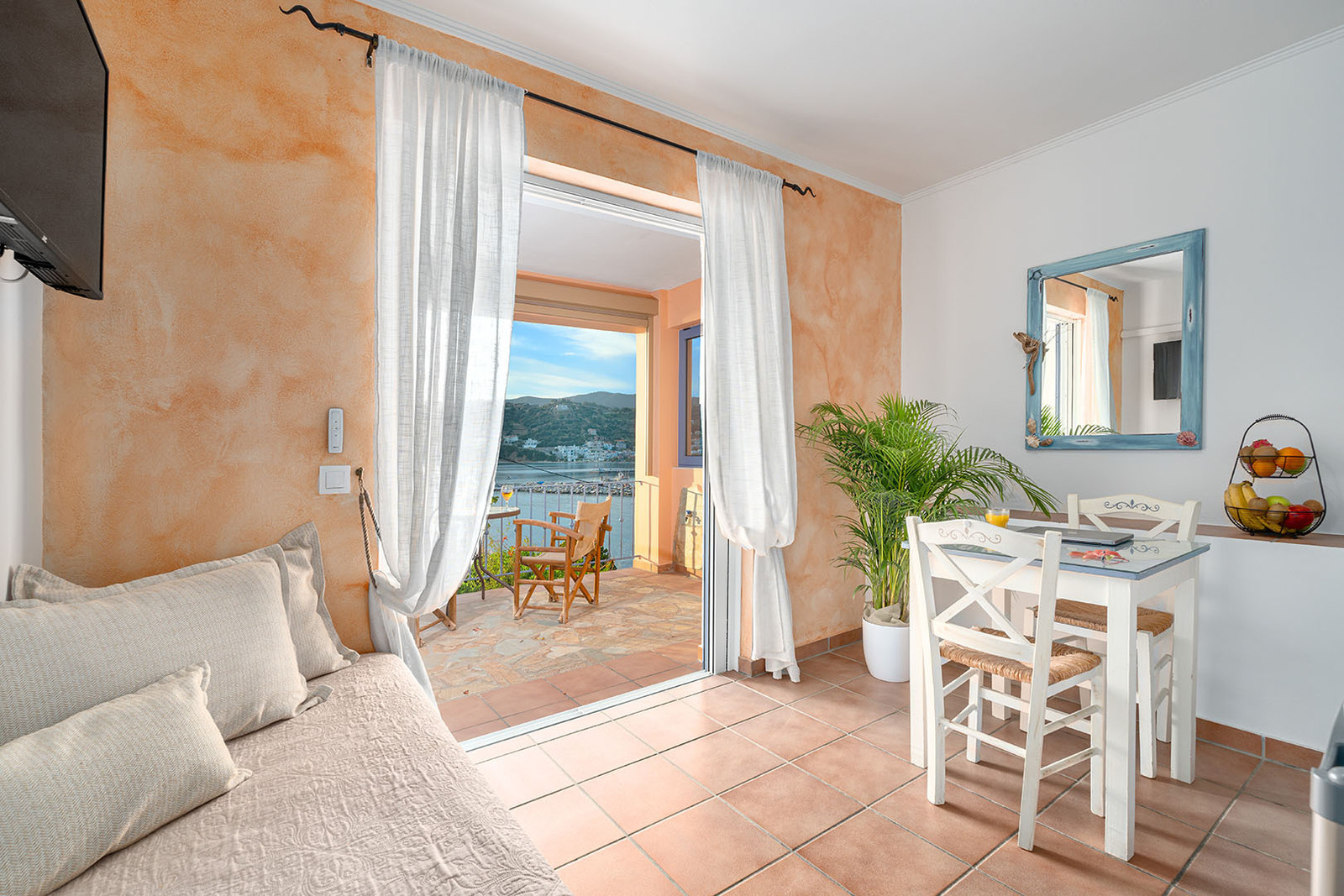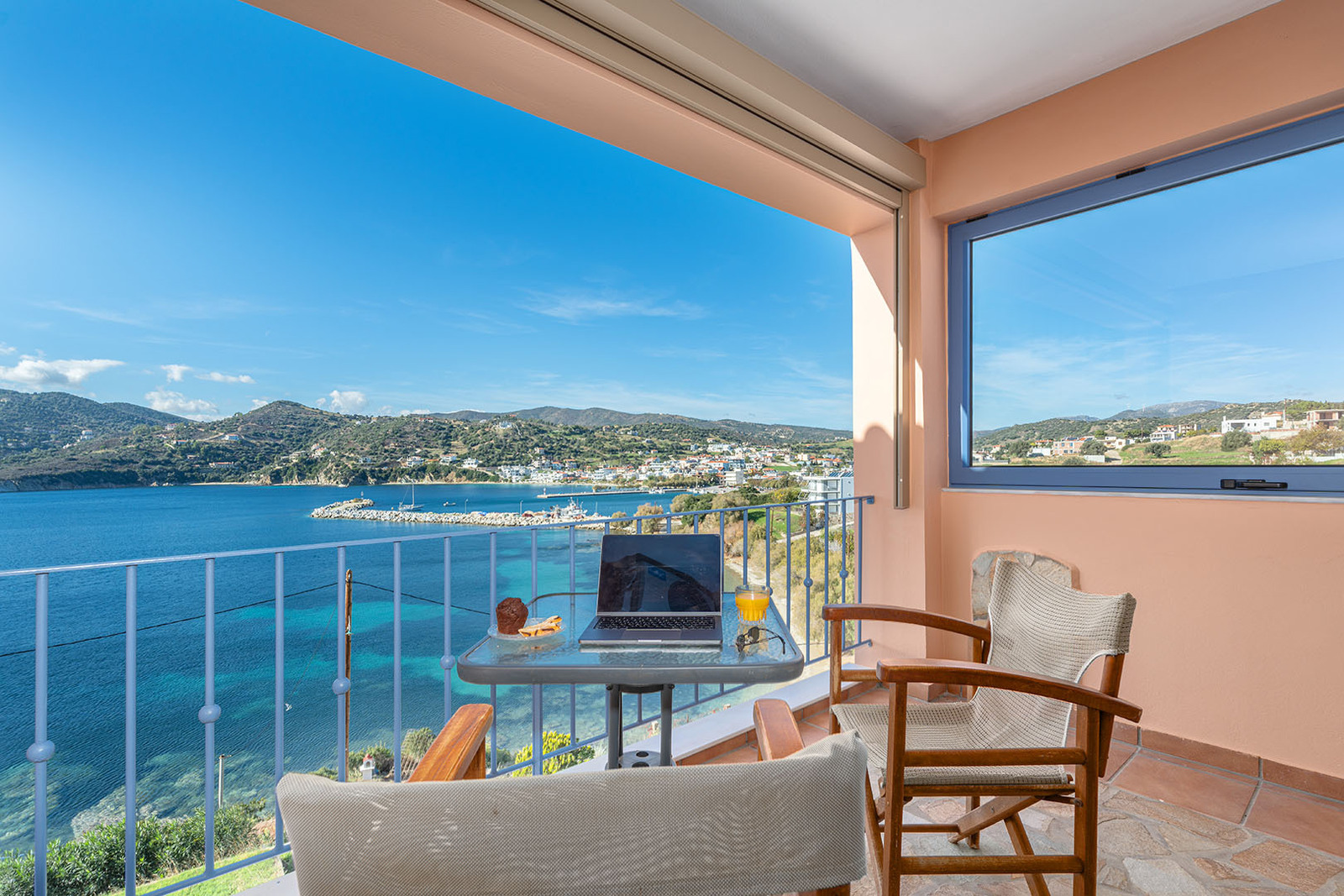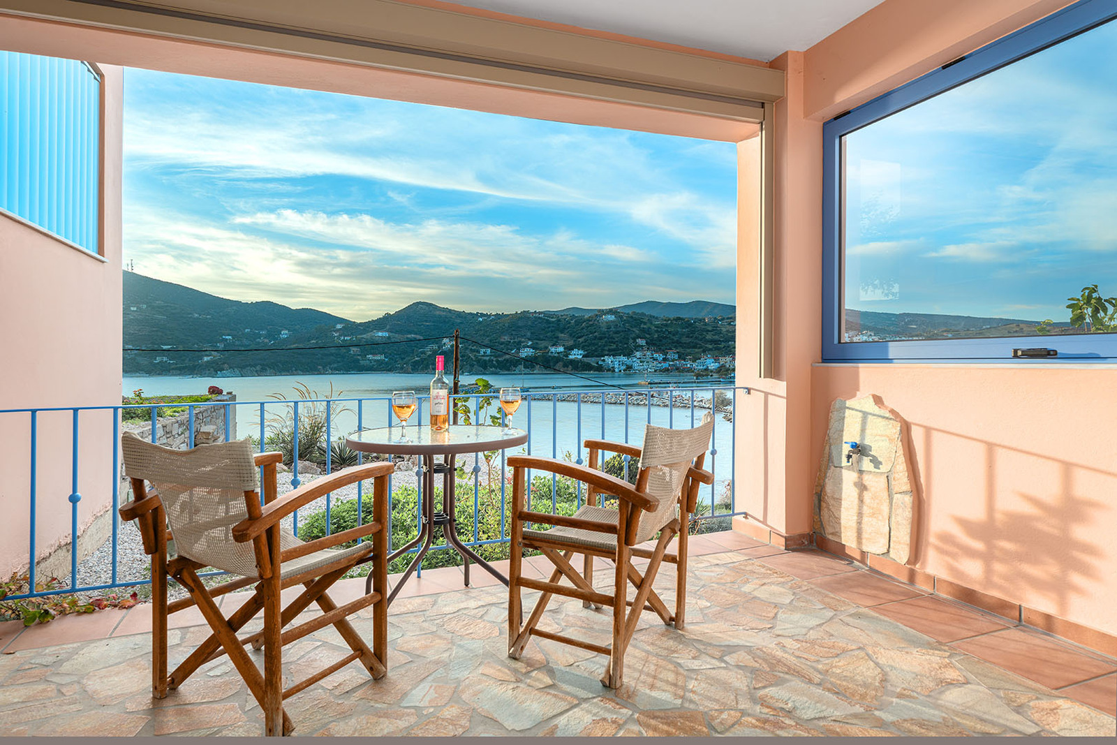 Each room is cozy and offers comfort and a signature authentic Greek hospitality. All of the rooms are individually furnished and feature furniture personally painted and other handcrafted as well. Each apartment has its own private balcony gazing at a magnificent view of the picturesque port of the village and the sparkling Aegean sea. Every evening you will have the chance to witness the breathtaking sunset that unfolds opposite of our property under the red sky.