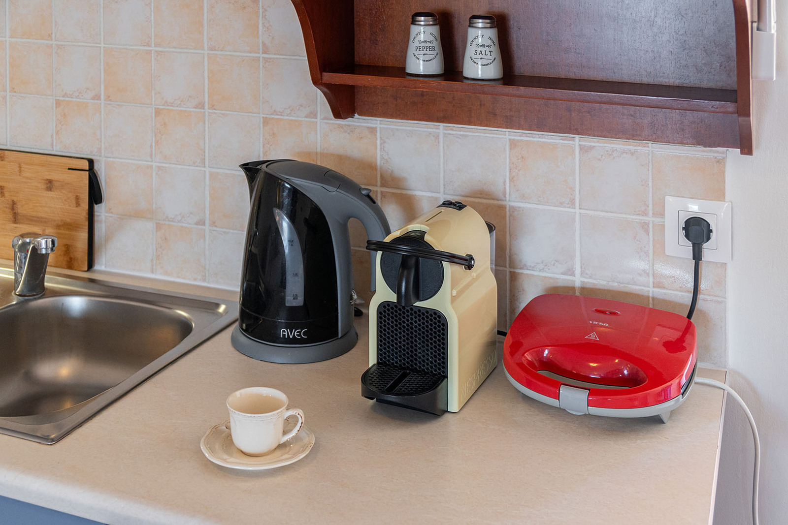 Every family apartment has its own private balcony with an amazing seaview and a fully equipped kitchen where you can prepare your meals. The apartment is 35 square meters and has one iron double bed and one iron single sofa-bed, a wardrobe, its own bathroom and a balcony. The bedroom is separate from the kitchen/living room which makes it ideal for families of three.